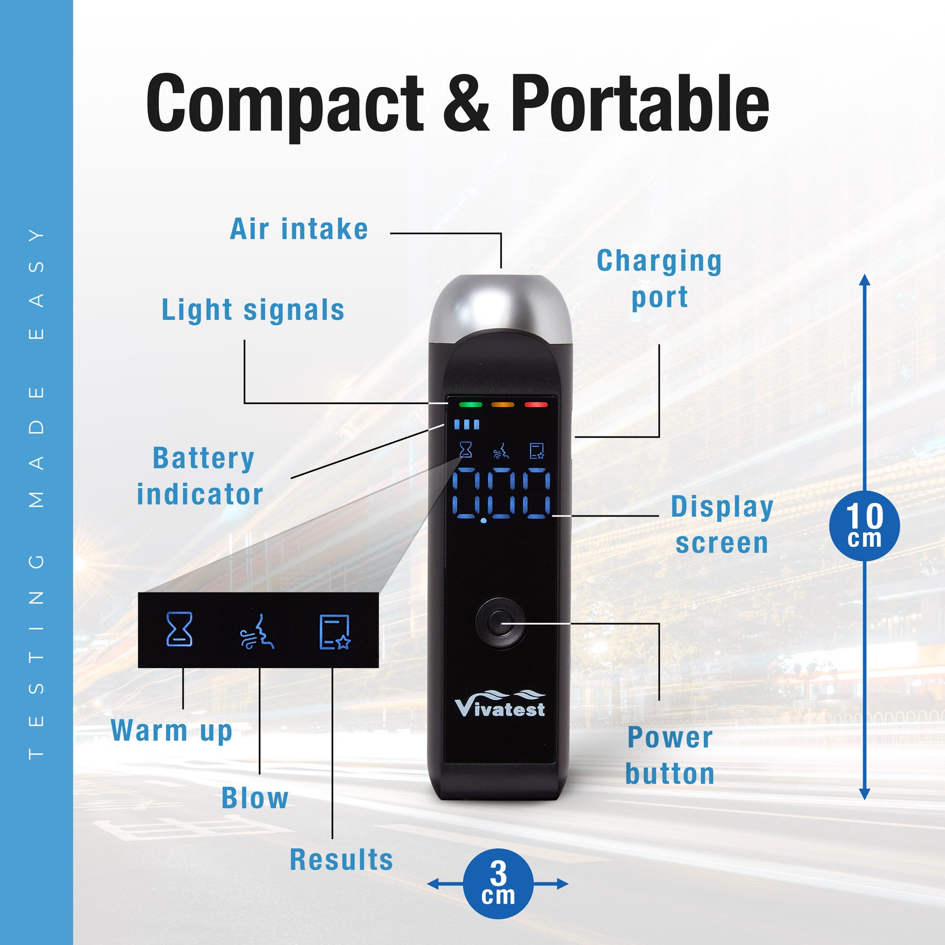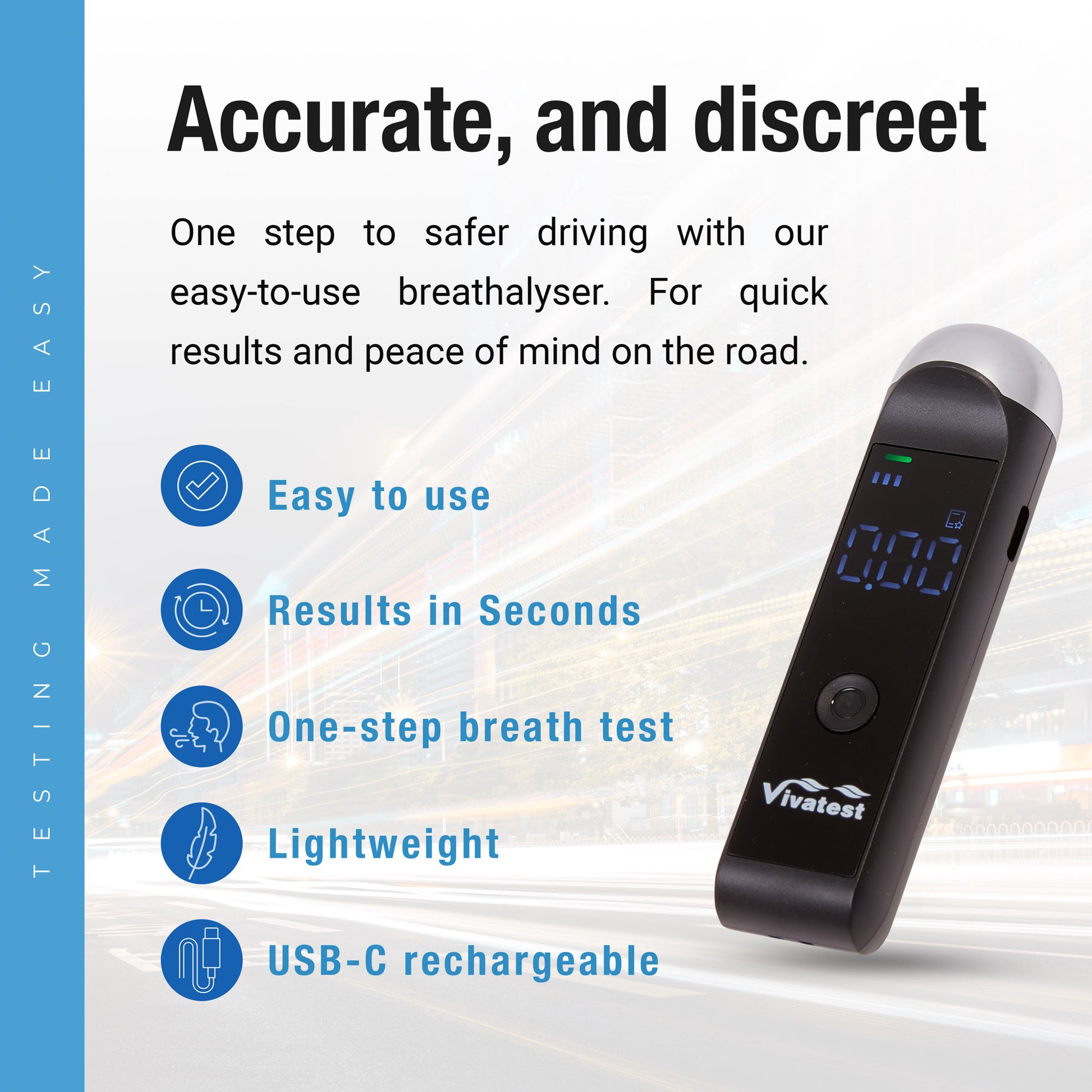 The VivaTest Digital Breathalyser is a compact, easy-to-use alcohol tester designed for fast personal screening.