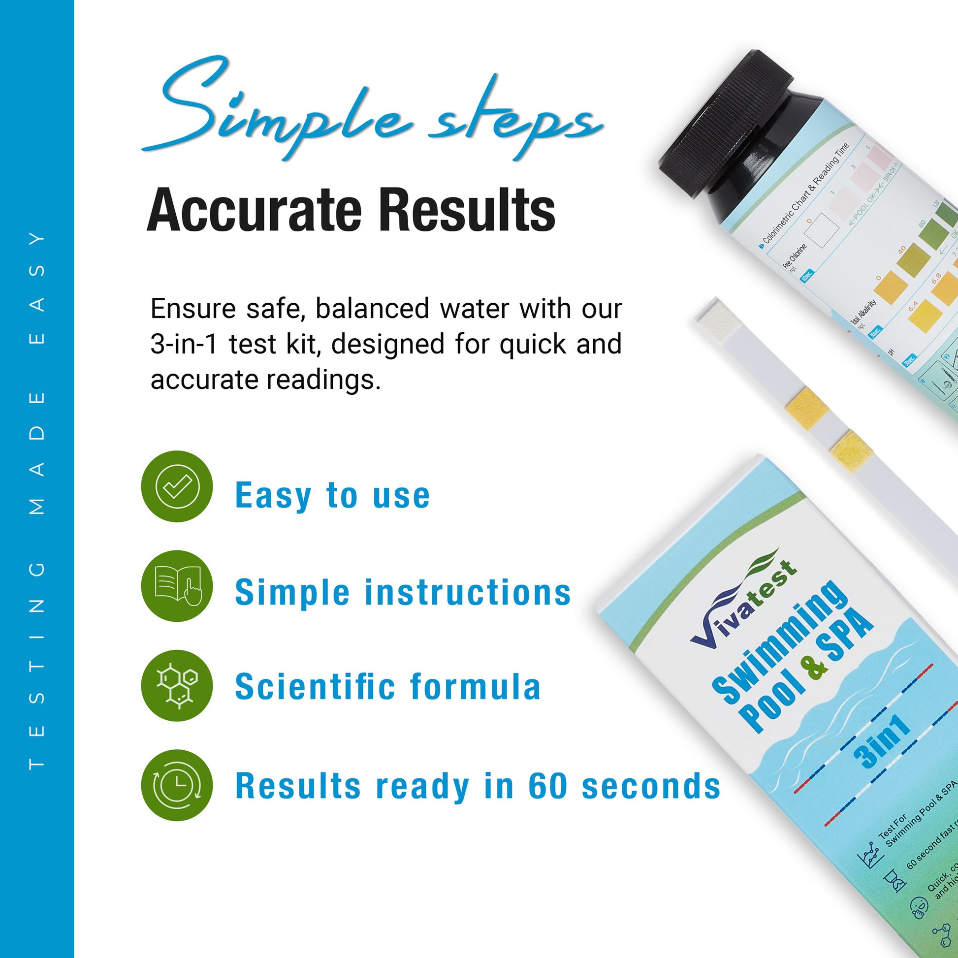 VivaTest Swimming Pool & Spa Test Strips measure three essential water indicators: